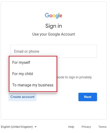 फिर क्रिएट अकाउंट पे क्लिक करे उसके बाद For myselfFor my childTo manage my business ये सभी में से कोई एक पे क्लिक करे जैसे की अगर आप आपने लिए जीमेल बनाना चाहते है तो फॉर माइसेल्फ पे क्लिक करे। अगर आप आपने बच्चे के लिए बना रहे है तो फॉर माय चाइल्ड पे क्लिक करे। और अगर आप आपने बिज़नेस के लिए जीमेल बना रहे है तो आप तो आप To manage my business पे क्लिक करे।