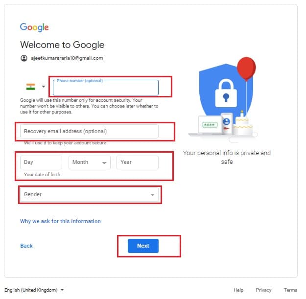 उसके बाद आपके सामने कुछ इस तरह के ऑप्शन शो होगा। Phone Number में आपने मोबाइल नंबर डालें, Recovery Email Address me अगर आपका कोई पहले से ईमेल हो तो डाल सकते है। फिर आप आपने डेट ऑफ़ बर्थ (Date of Birth) डालें। उसेक बाद आप अपना जेंडर (Gender) डालें। फिर Next पे क्लिक करें।