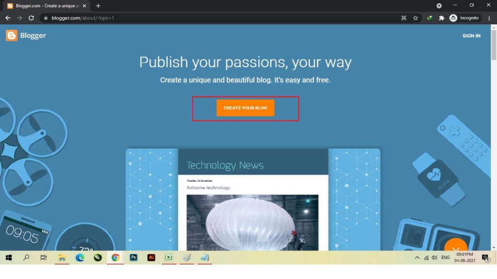 अब आप यहाँ पे क्लिक करें ब्लॉगर और फिर आप Create Your Blog पे क्लिक करें।